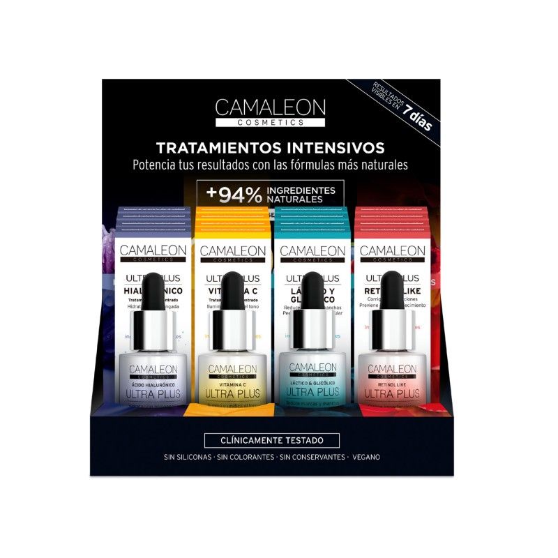 Expositor ULTRA PLUS. 16 unidades. (4 x 4 tipo). Reninol Like / Láctico & Glicólico / A. Hialurónico / Vitamina C